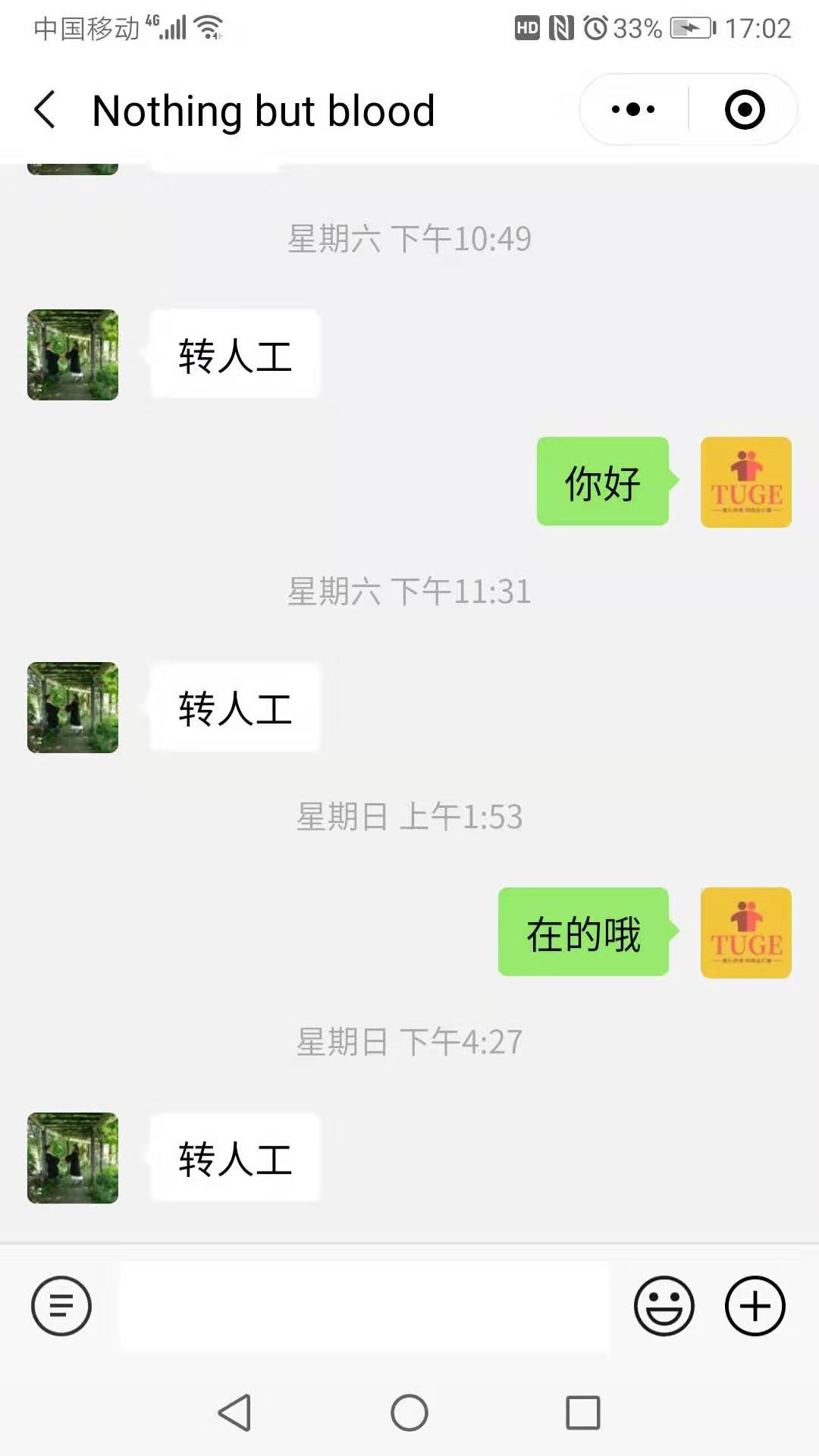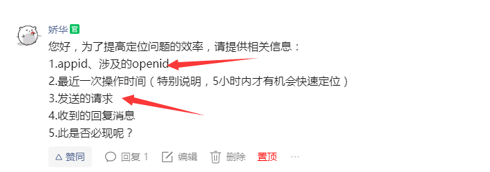 您好,为了提高定位问题的效率,请提供相关信息:1.appid、涉及的openid2.最近一次操作时间(特别说明,5小时内才有机会快速定位)3.发送的请求4.收到的回复消息5.此是否必现呢?