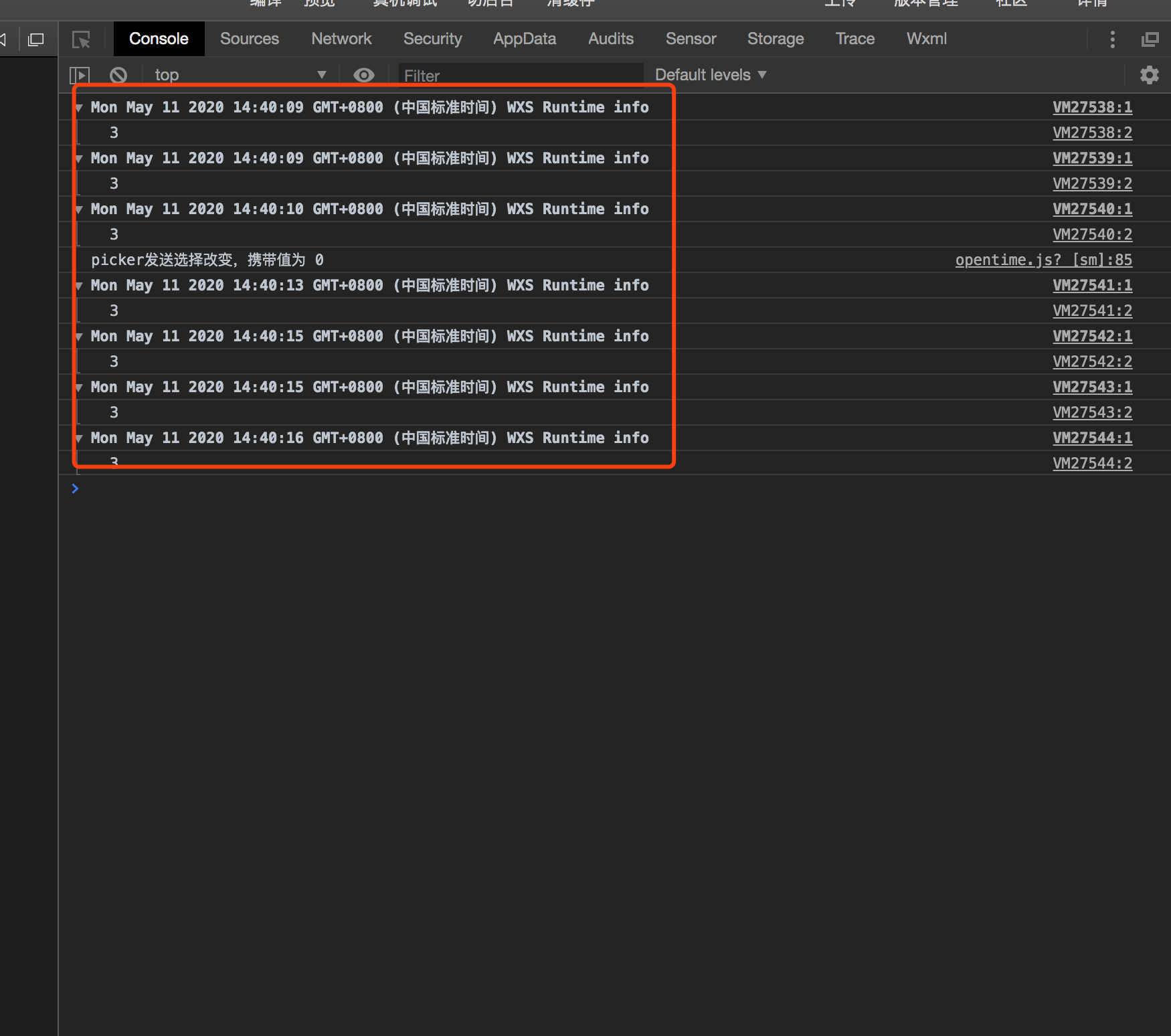 查找一下 WXS 代码里面是不是有 console 调用?
