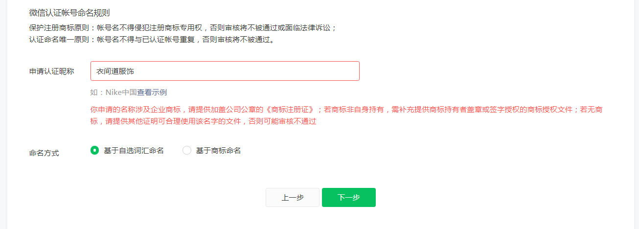 请问公众号年审时,申请认证昵称没有改变也没有注册商标,点击下一步时就提示涉及企业商标,我们公司是个体户经营,没有商标认证的,怎么年审?