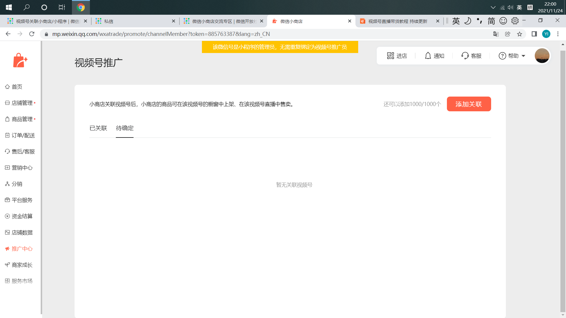 如图所示,想要关联视频号时,显示了黄色部分提示。但我的视频号里面没有关联小商店并且找不到关联小商店的入口。形成了死循环,请帮忙尽快解决。