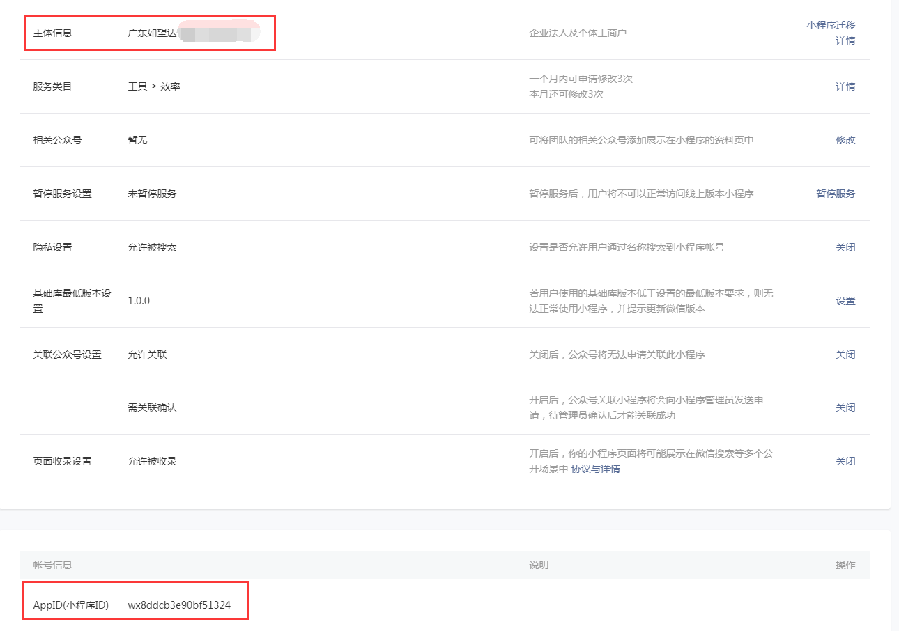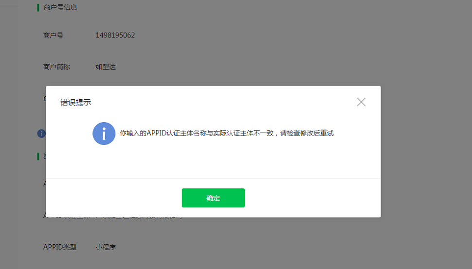 问题描述:小程序(wx8ddcb3e90bf51324)认证主体已经从【广州财略**科技有限公司】迁移至【广东如望达**有限公司】,在接入微信支付商户(微信支付商户1498195062,企业为【广东如望达**有限公司】)时,进行(AppID绑定),却一直显示小程序认证主体与实际主体不一致。但是小程序的主体跟微信支付商户的主体确实都是广东如望达的,不明白为什么说不一致
