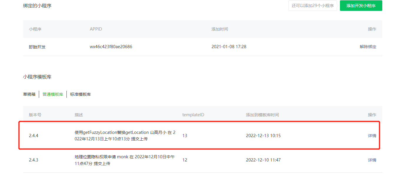 目前小程序代码已经成功发布到开放平台的“普通模板库”,如下图所示