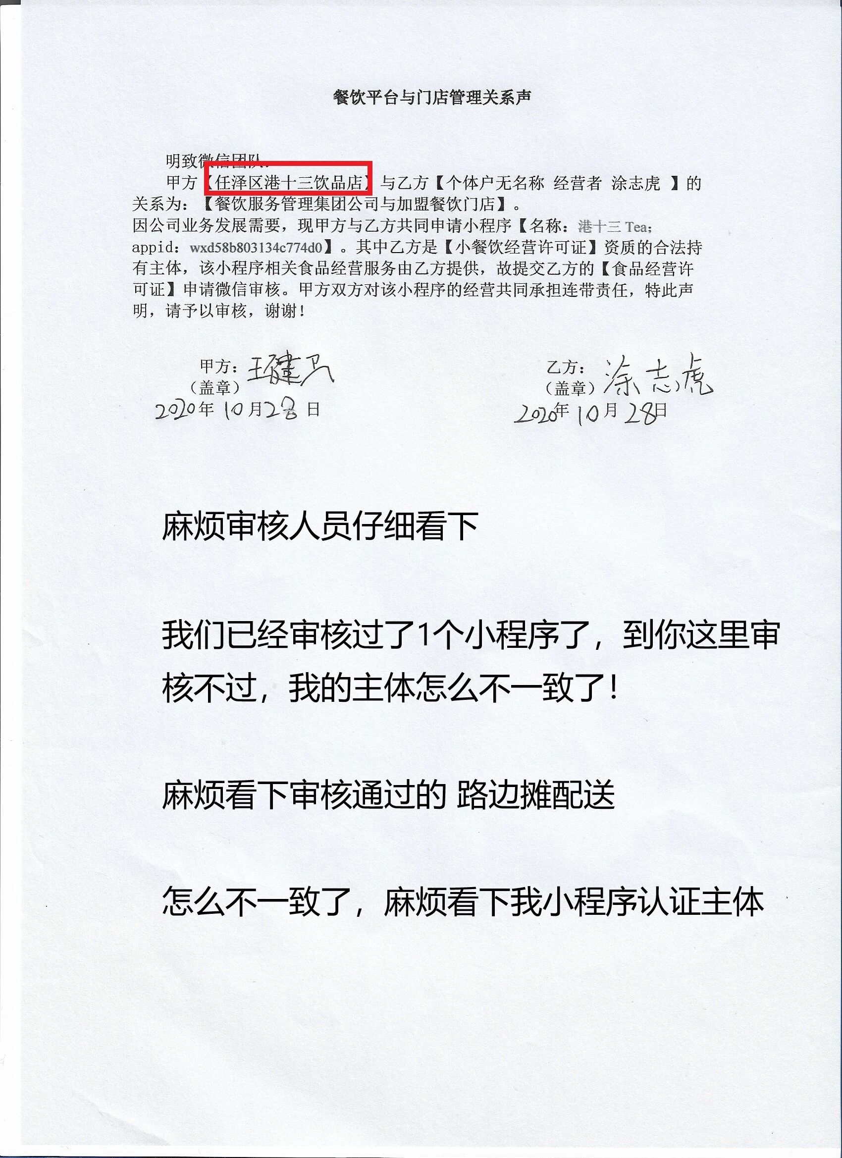 你好,用户提供的关系声明,未在公开渠道核实到相关信息,建议同时提供加盟协议,以供进一步评估,或用小程序注册主体申请餐饮相关资质 或 以资质主体做小程序申请“餐饮-餐饮服务场所/餐饮服务管理企业”类目。