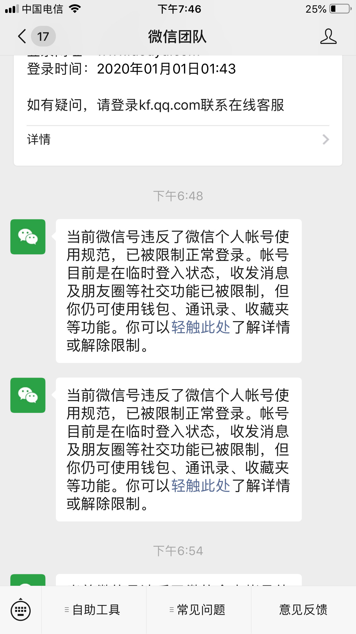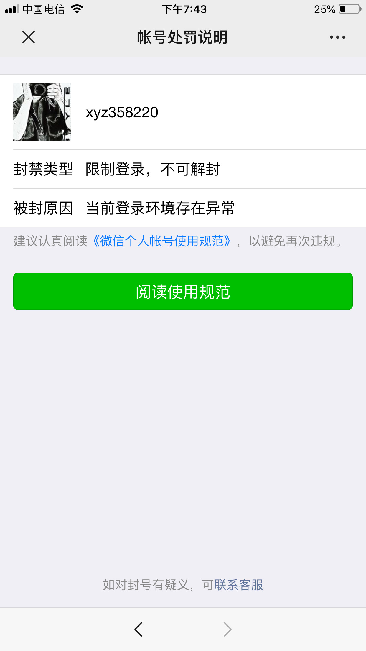 账号用了快1年了,没在朋友圈发过广告,微信里面都是同学好友同事客户,就这一个微信,不知道为什么突然就限制登录不可解封了,打电话、官网申诉都没有得到回应。有没有官方的人能帮忙解答一下?已经严重影响工作生活了。如有能帮忙得万分感谢!!!微信号:xyz358220