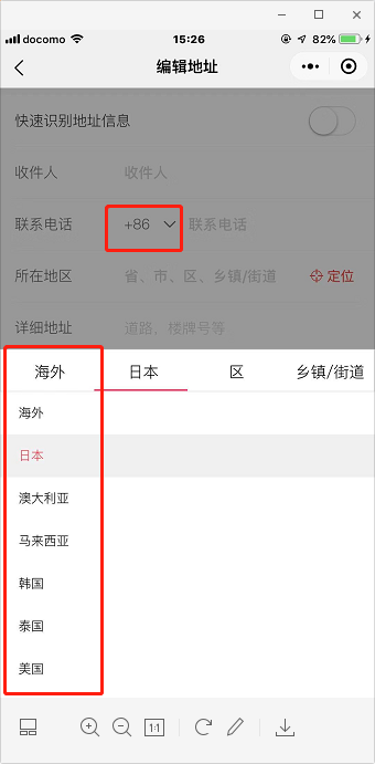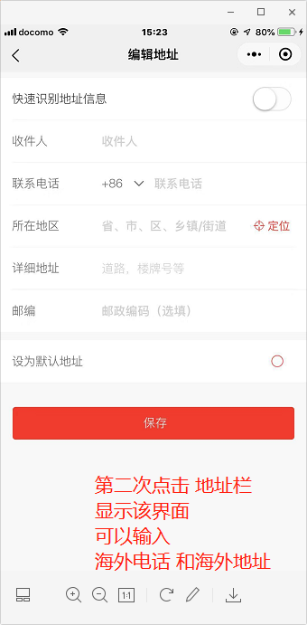 第二次点击【地址栏】进入输入收件地址页面,是微盟研发的收件地址页面,可以输入海外电话和地址。