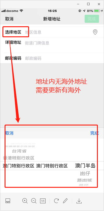 进入商城--点击商品--进行购买--需要输入收件地址 如图--第一次点击【地址栏】 不能输入海外电话和海外地址,仅支持中国---点击返回--第二次点击【地址栏】才能输入海外电话和海外地址。