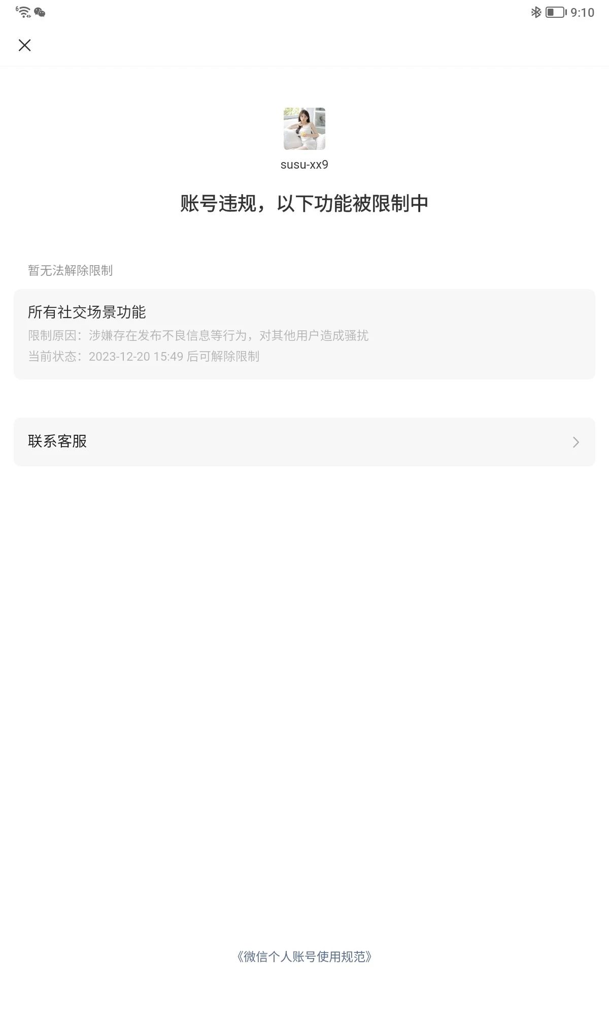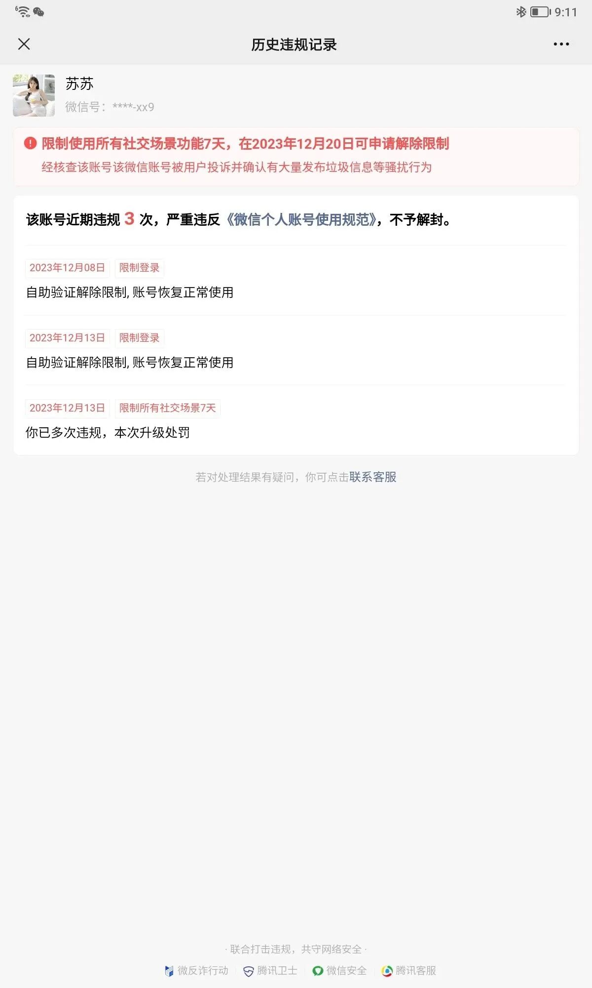 本人微信号:susu-xx9,如图所示,在2023年12月13日,自助验证解除限制之后,并无任何违规行为,切并无发布任何不良信息,没有添加任何一个好友,系统检测直接限制登录并封禁七天,如果我有发不任何违规行为的记录封禁我也认了,关键我解封后只是在工作群里发了p英文字母而已,这是我们工作签到,这也算不良信息吗?实在不理解违规在哪里了。恳请相关客服人员查询,给予解封或告知13日解封后哪里违规了
