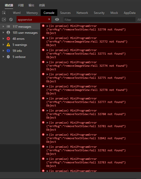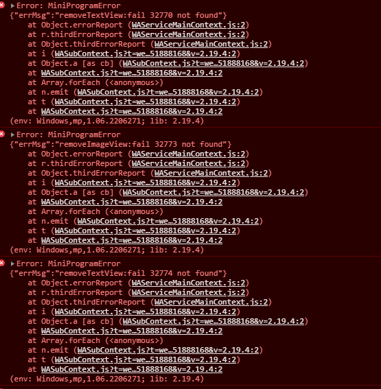 从文章详情页返回首页(也是文章列表页)时,一下子涌出几十个类似的错误提示:VM2038 WAService.js:2 (in promise) MiniProgramError {"errMsg":"removeTextView:fail 32770 not found"}。