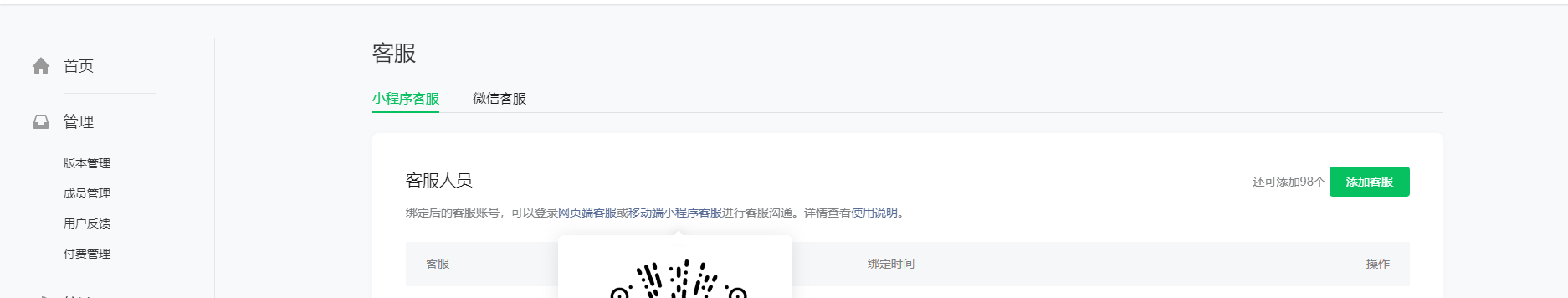 你再仔细看下文档,应该很清晰了,先把思路定位到微信文档上,然后再看看自己的需求是否一样https://developers.weixin.qq.com/miniprogram/introduction/custom.html#%E7%BB%91%E5%AE%9A%E5%AE%A2%E6%9C%8D%E4%BA%BA%E5%91%98