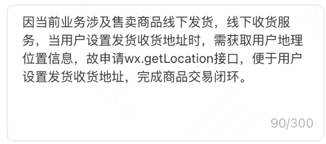 哥们,单纯设置个收货地址,你获取人家用户位置干嘛,所以不给你通过。可以使用chooseLocation或者其他方案设置收货地址