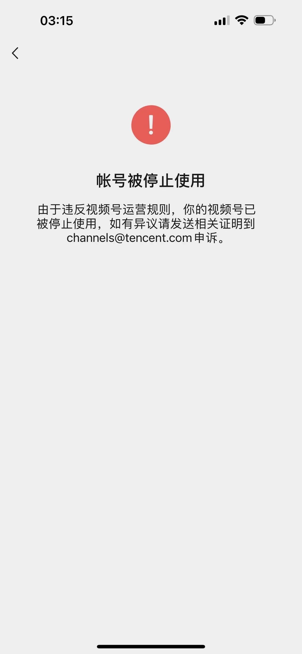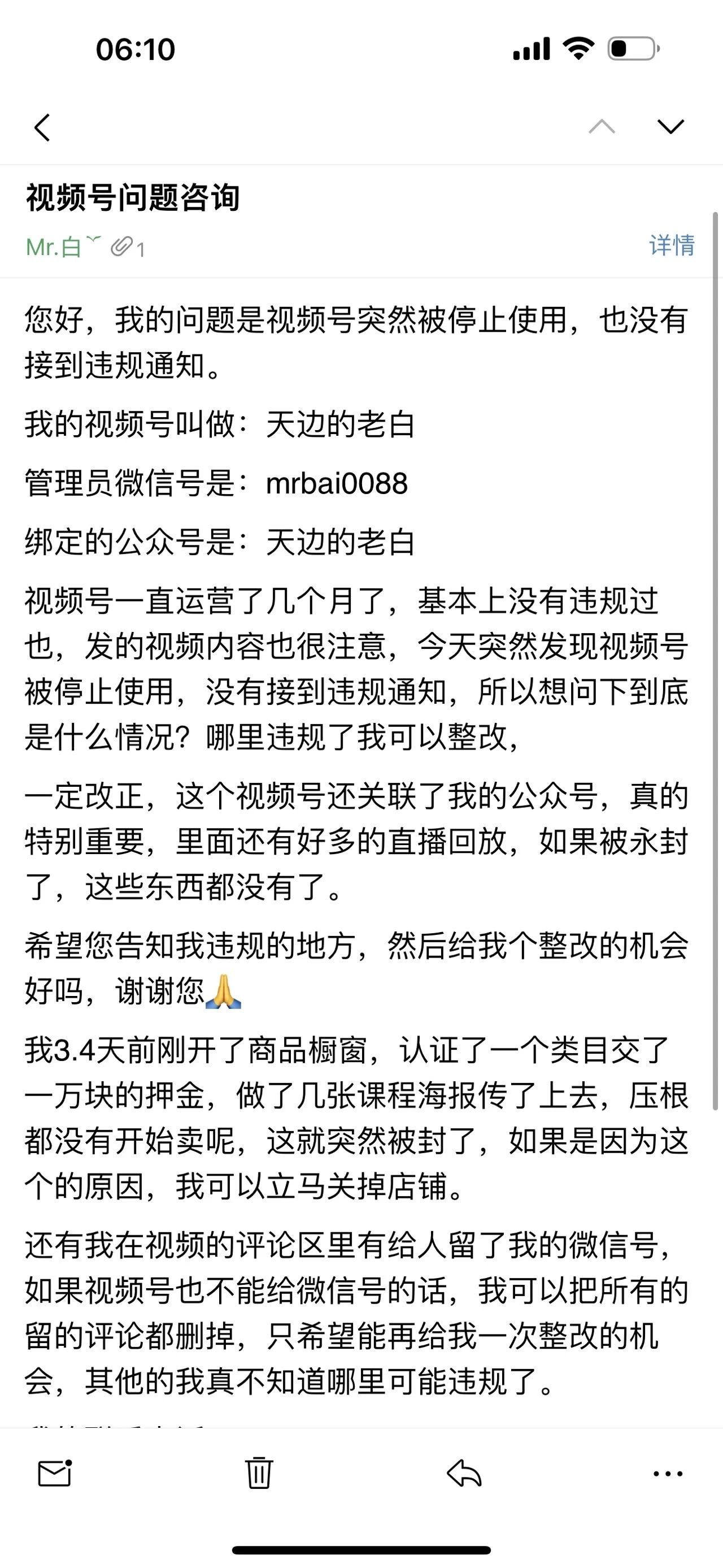 您好,我的问题是视频号突然被停止使用,也没有接到违规通知。 我的视频号叫做:天边的老白 管理员微信号是:mrbai0088 绑定的公众号是:天边的老白 也给视频号邮箱发过邮件了,但是是机器人自动回复,申诉的邮箱是 baiyu0088@qq.com