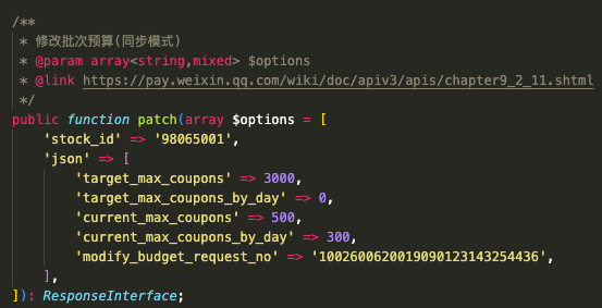 ->patch(['json' => $data]);PS: 建议安装IDE提示包 https://packagist.org/packages/iwechatpay/openapi ,请求数据结构一目了然