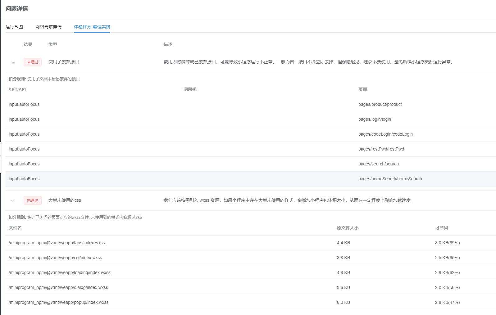 为了方便开发者快速验证版本性能表现、及时发现性能质量问题,小程序云测服务 上线 小程序质检报告,一站式查看启动性能、运行性能、异常监测、网络监测等各个环节的小程序质量问题,助力开发者提前发现潜在问题。(👉 查看 使用教程)