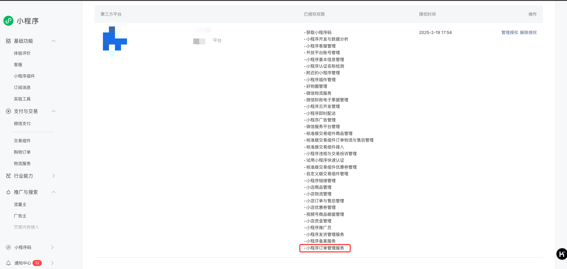 排查方向:已授权给第三方平台 182小程序订单管理服务 这个权限集,依旧返回48001,api unauthorized rid: 67b69021-1f351d89-59d6d9c9