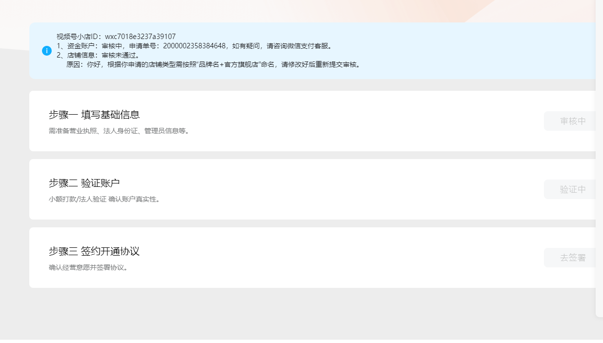 你好,资金账户和店铺信息均审核完毕才会出现修改页面,待审核完毕,请在设置页面重新进行修改。