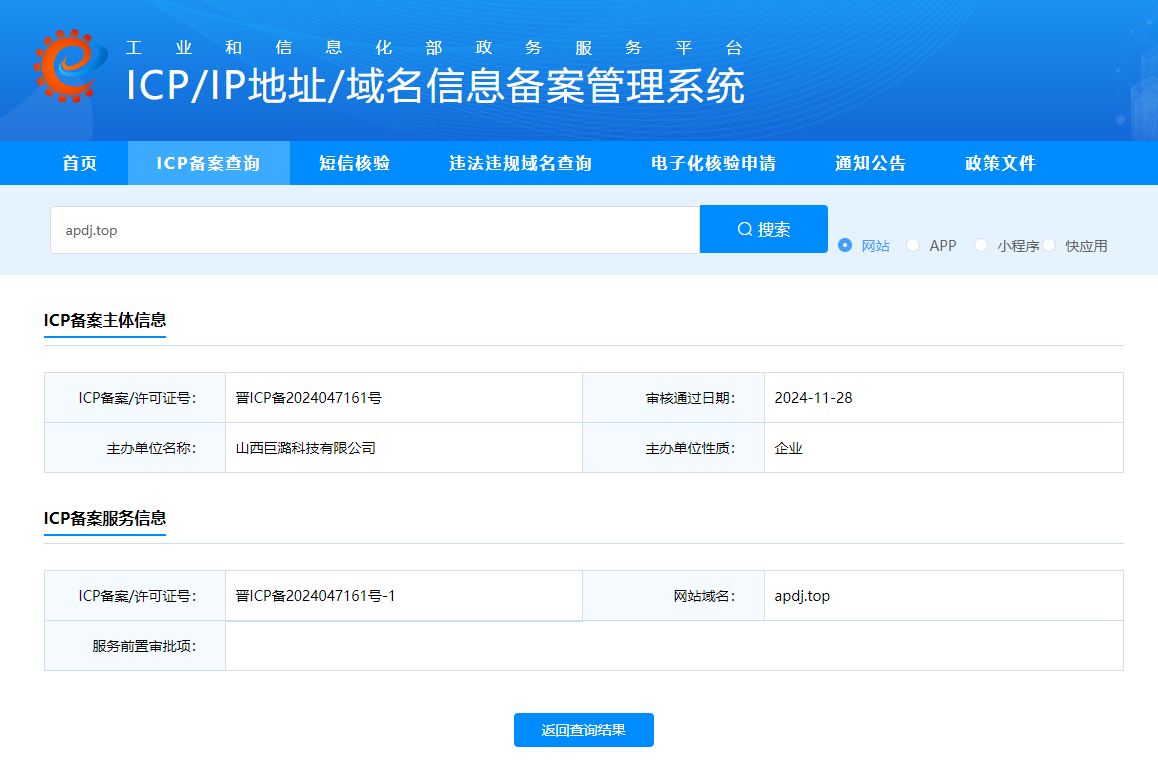 我们的域名内容(https://web.apdj.top/pro),没有强制或者特别的要求,备案主体也是地方平台公司,域名备案号:晋ICP备2024047161号-1。