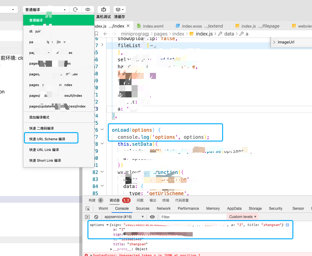 2. 在小程序开发者工具选择快速url scheme 编译 ,把抓包拿到的scheme填进去,在控制台就能看到options 的参数,是options, 不需要options.query