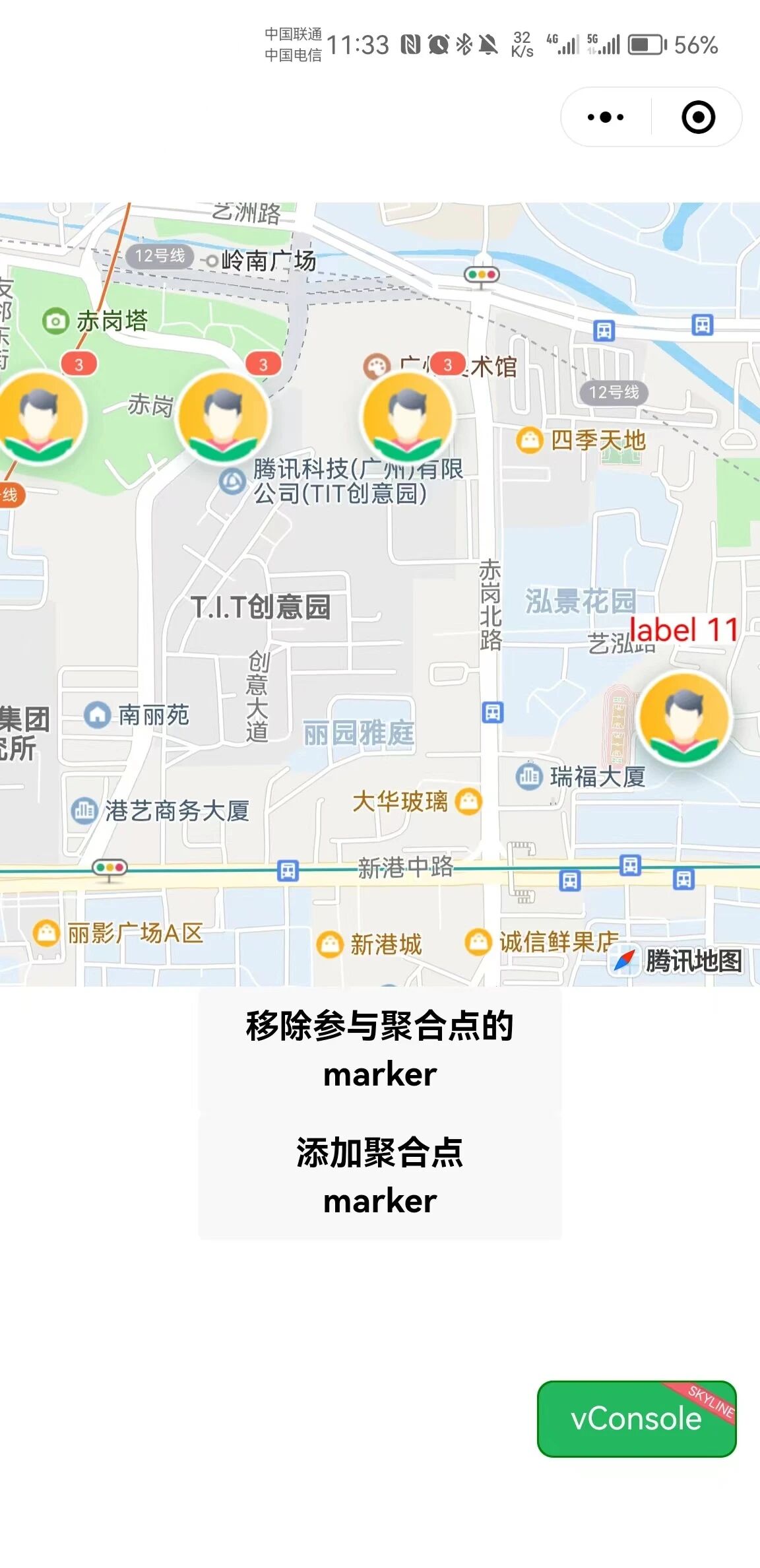 开发者工具编译后,查看手机,发现三个标记点的可以聚合,两个标记点没有重合,放大够大的情况下可以看到两个标记点