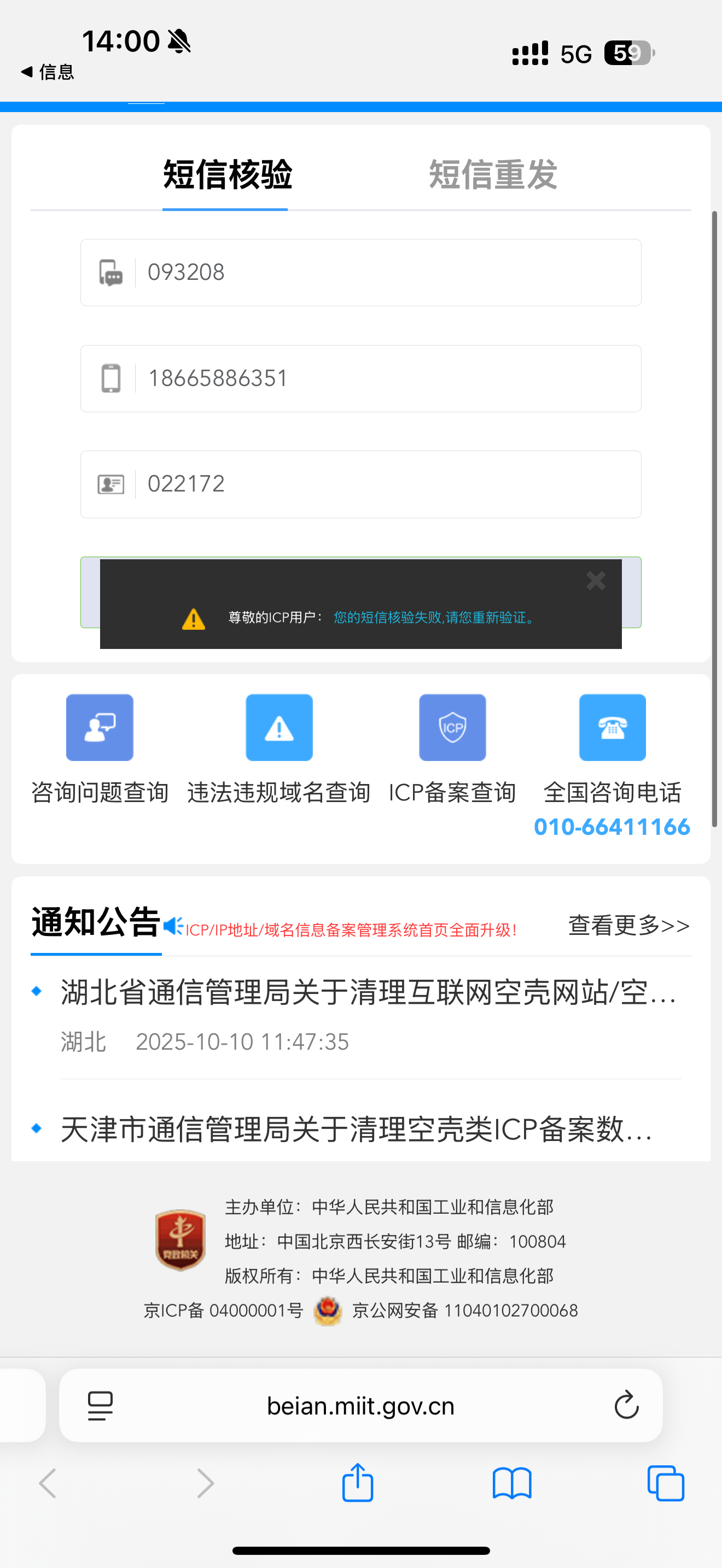短信验证码 /备案负责人/证件号都正确,就是死活不成功,工信部 电话打过去了 ,对方让找腾讯核对 具体错误