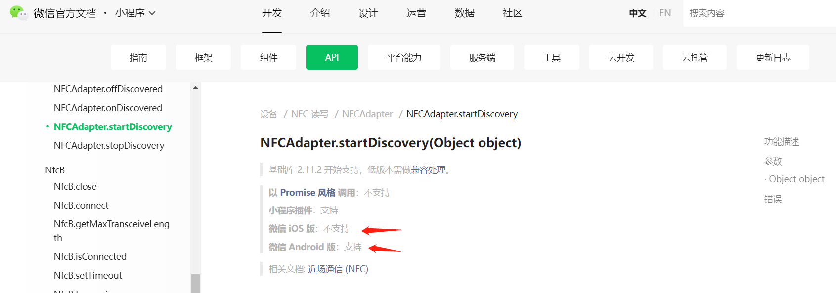 NFCAdapter.startDiscovery会报错startDiscovery:fail current platform is not supported, 无论安卓,苹果都会报这个,请问下这个能解决吗?