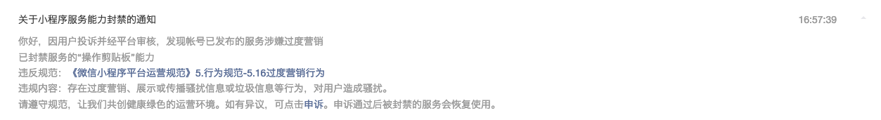 我们在小程序端的操作剪贴板能力被封禁,小程序内的复制粘贴,都是用户主动点击复制按钮进行复制,并没有恶意进行操作剪贴板。官方有什么整改的意见,避免再次被投诉?小程序id wxcab372f4ca22cfcd