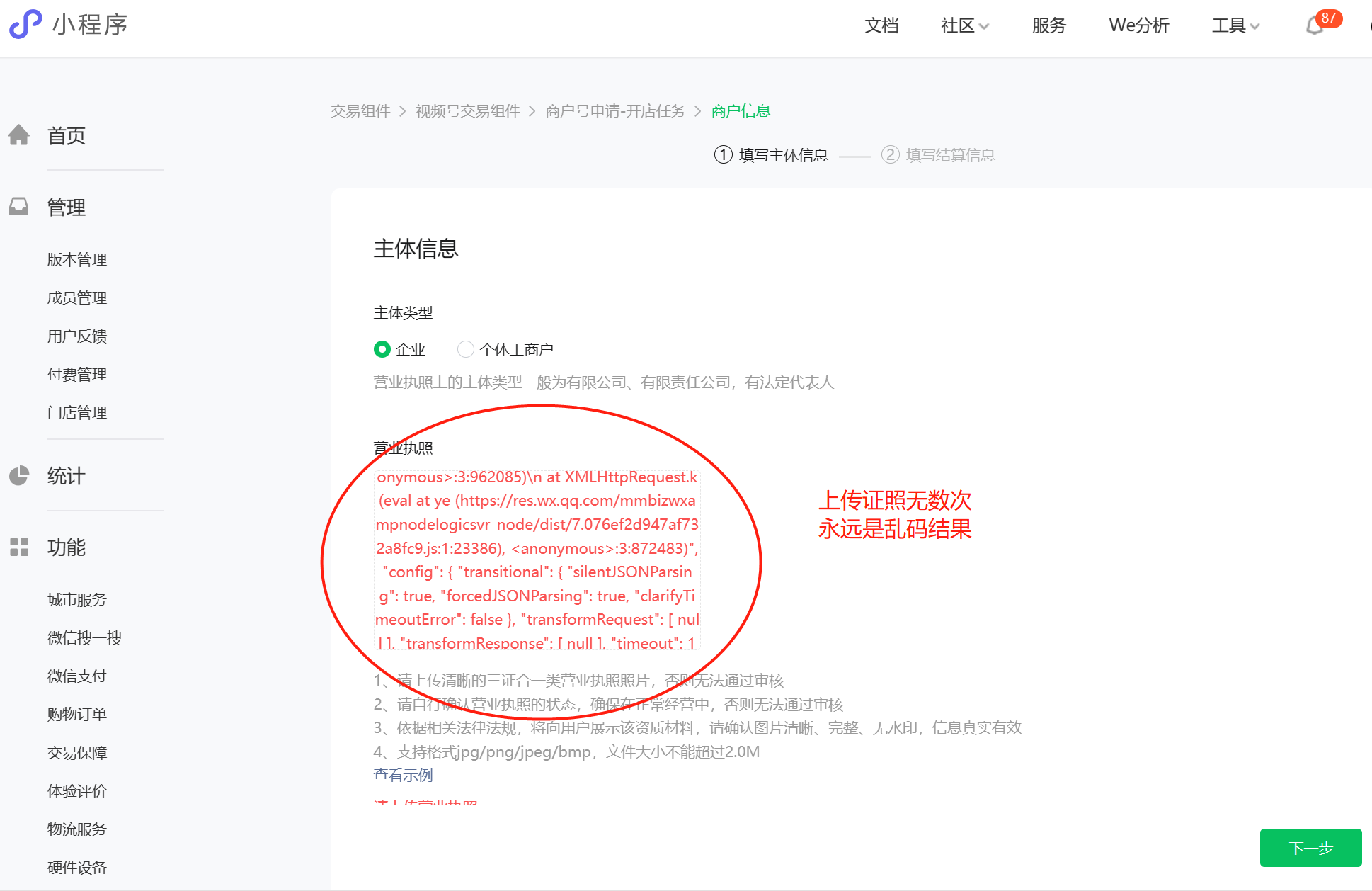 同样问题,换了很多个浏览器和电脑都反馈乱码。等几天了一直无法上传证照。微信团队没人解决吗?