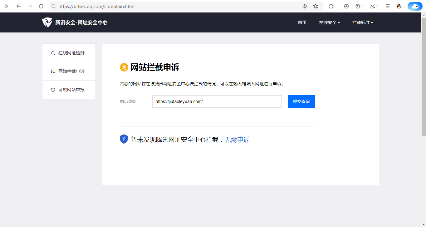 域名链接:jiutaoleyuan.com,在微信内打开时,提示“网页存在安全风险”。网页已完全合规合法,内容不涉及违规信息,但依然被微信拦截。请协助核查具体原因并提供解决方案。 说明: 1、该网站已通过安全检测,不存在外部交互链接、违规内容或安全漏洞; 2、网站已完成备案(备案号:渝ICP备2020010931号-1),网站内容合法合规;恳请贵团队重新审核我们的域名,并予以解封。感谢您在百忙之中审阅我们的申诉,期待您的回复!
