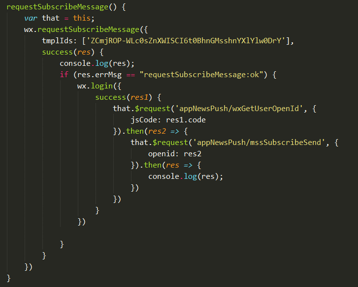 1:前段:通过按钮触发消息订阅通知 ==> 方法名:requestSubscribeMessage()