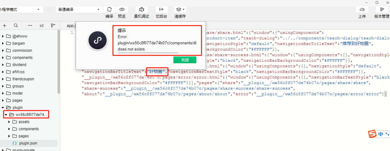 人人商城小程序 真机调试的时候出现了 下面这个问题 好像是 好物圈 插件包问题 请问大神们 怎么解决 不懂微信小程序 我所想到的是 重新下载 好物圈插件包 替换上 不知是否可行? 还有 好物圈插件包在哪下载?