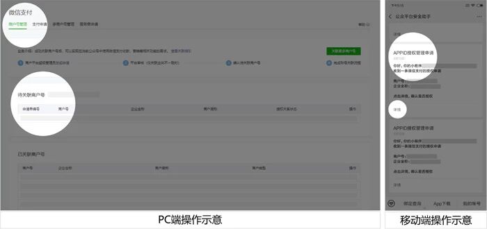 小程序:前往公众平台,点击“微信支付-商户号管理”,查看相关商户号信息,确认授权申请,或在“公众平台安全助手”下发的模板消息中确认授权信息;