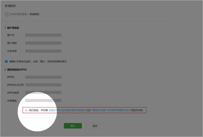2. 填写相关已认证APPID信息,在最下方阅读及签署《微信支付联合运营承诺函》和《微信支付商户号与APPID授权协议》,点击“确认”提交,发起授权申请;