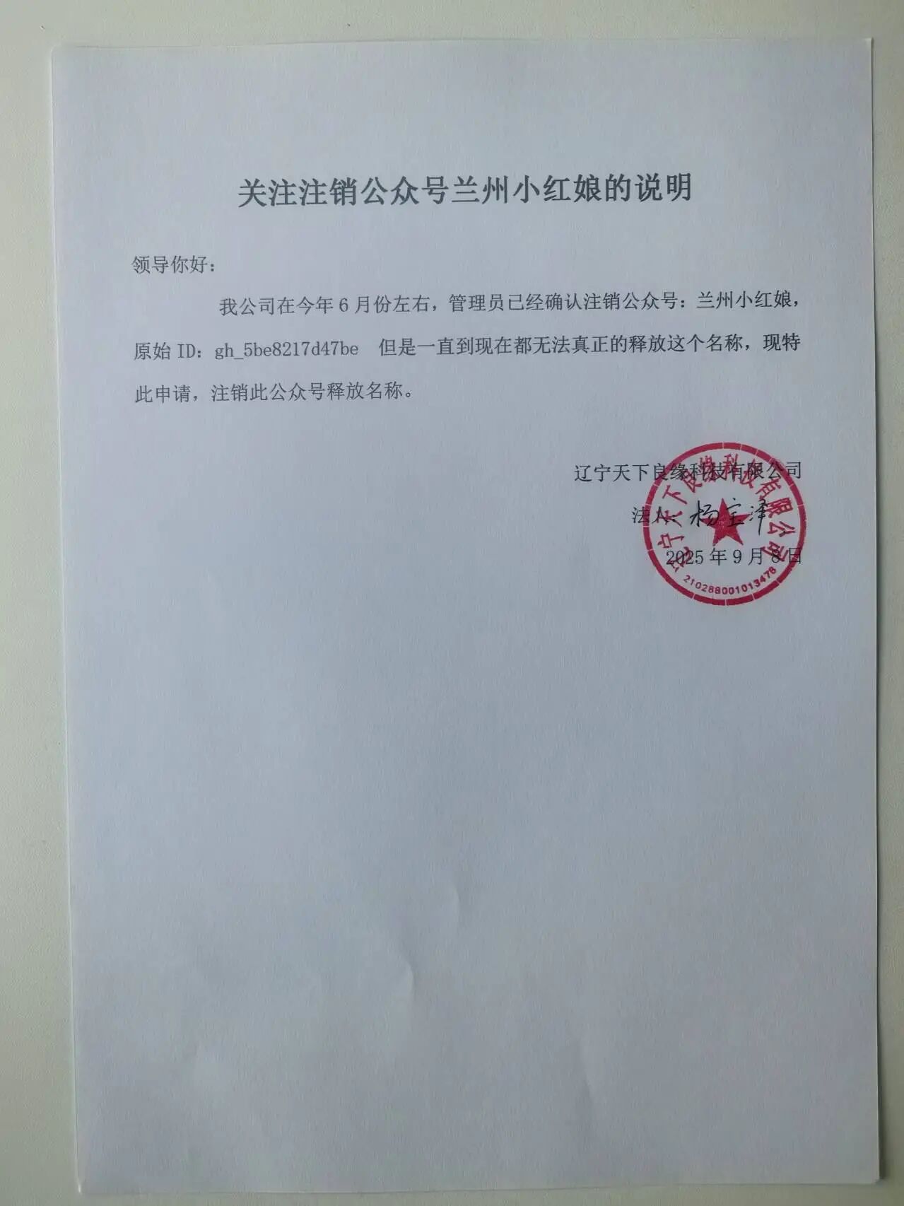 我公司在今年6月份左右已经确认注销公众号:兰州小红娘,原始ID:gh_5be8217d47be 但是一直到现在都无法真正的释放这个名称,现特此申请,注销此公众号释放名称。证明材料在附件。