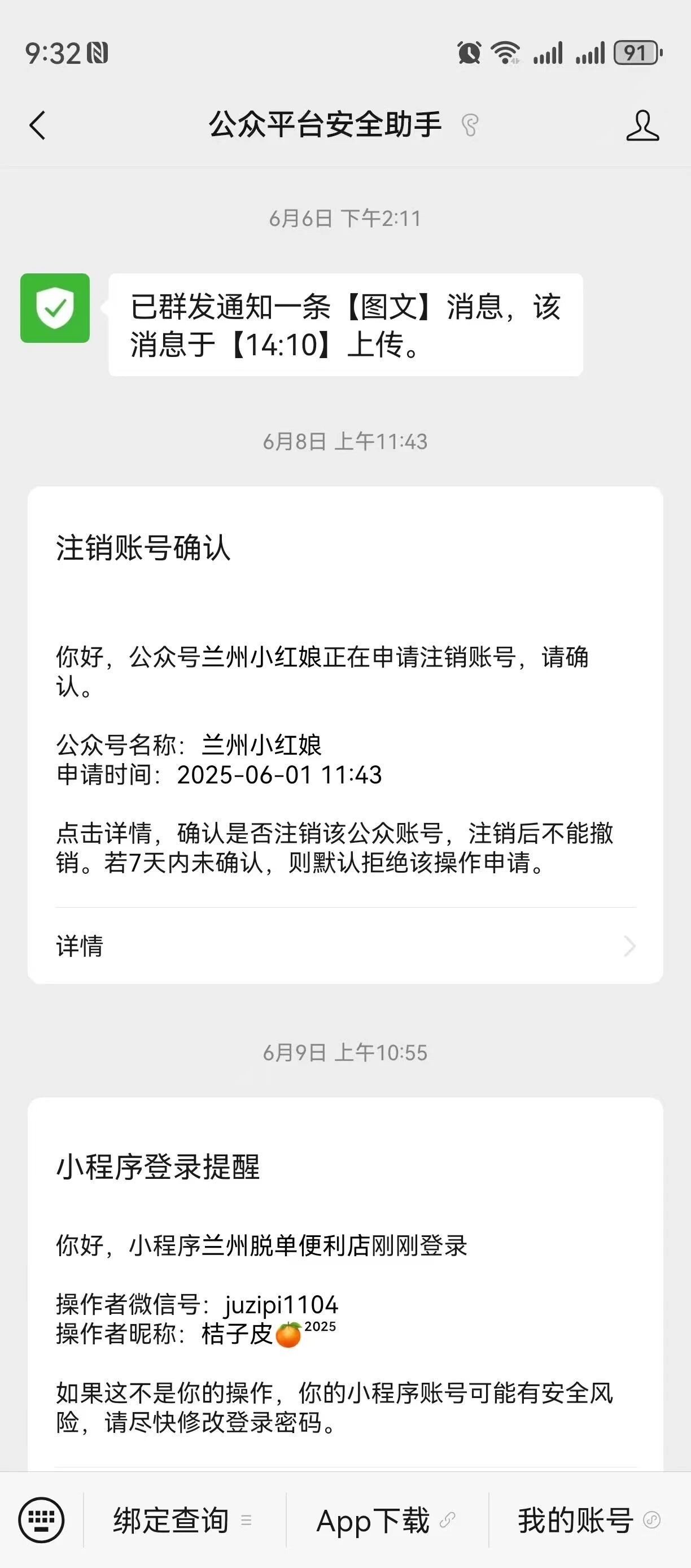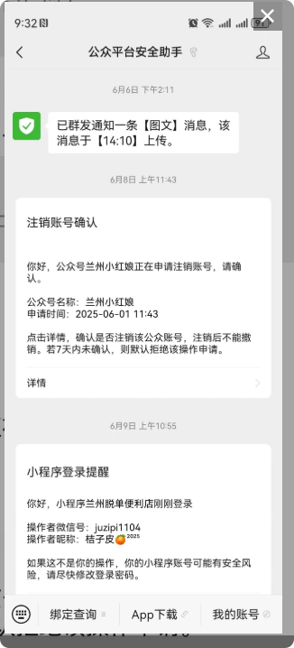 一看你提供的这2张截图,就是你在6月8号收到确认注销消息时为点击确定注销,第2张是今早刚点击的截图吧。正常注销后会收到注销成功的消息的。你应该有关注你的公众号【兰州小红娘