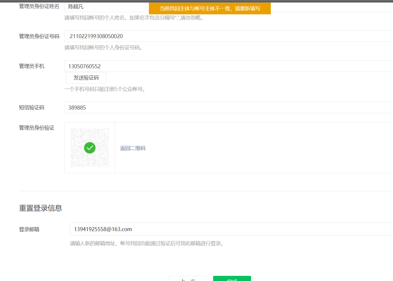 小程序绑定的管理员微信账号登录不了,需要重新找,需要找回小程序,按照页面提示把主体信息法人详情该填的都填了,但是最后他冒出来一个账号与主体无关联,请问一下这种情况该怎么解决?10万 50万火急,速回速回