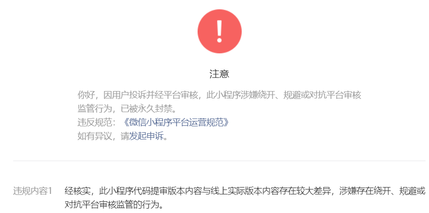 你好,平台对于违规小程序的处理是根据实际具体情况进行评估。如果对平台处理存在异议可发起线上申诉,会有专人处理。