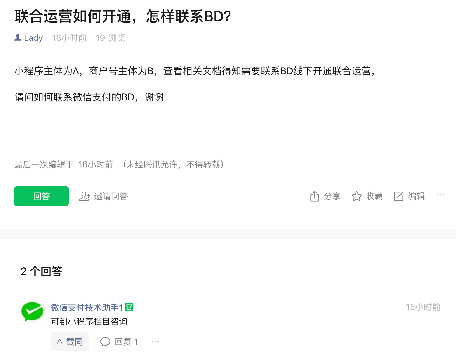 小程序主体为A,商户号主体为B,查看相关文档得知需要联系BD线下开通联合运营,