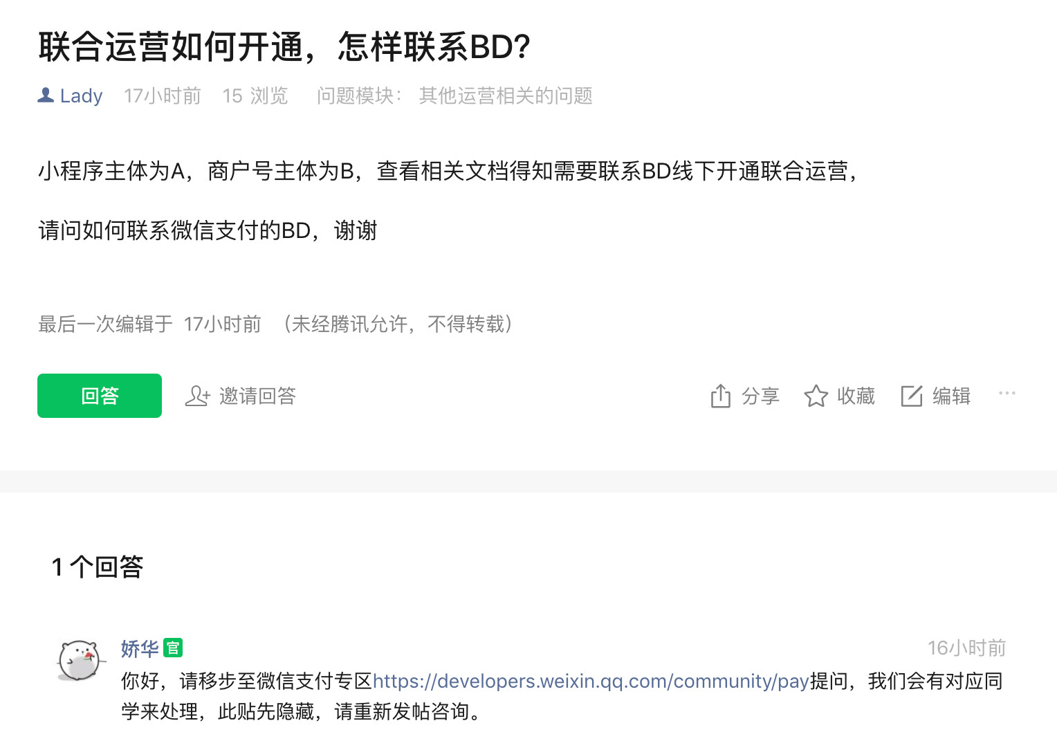 重要:之前发帖询问过,官方客服让我去支付模块提问,但是在支付页面提问时,微信支付的官方客服又让去小程序模块提问
