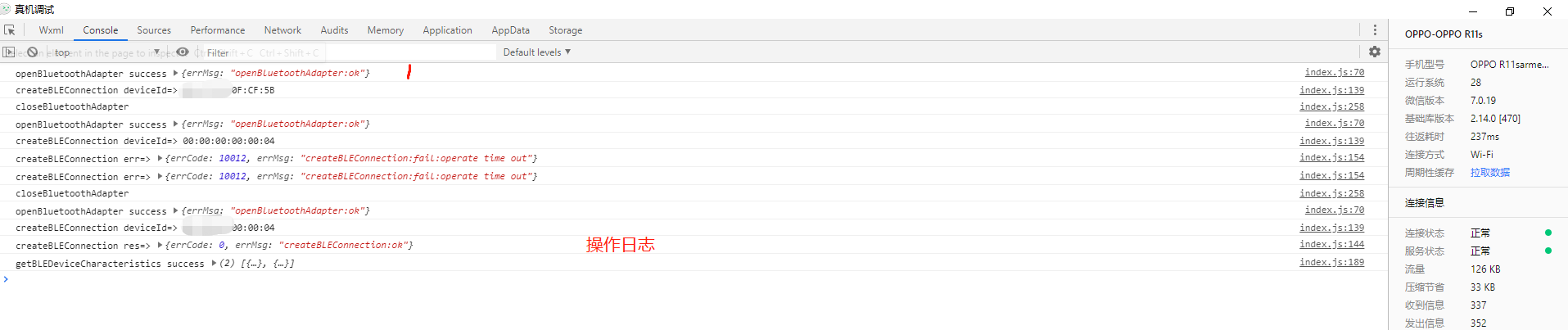 微信版本 Version 7.0.19 手机: OPPO R11S 安卓9 微信版本:7.0.15 手机: HUAWEI Mate 20 X 安卓9 在原生APP该两台手机是可以正常操作的,但是微信小程序都失败了。 如果说连接设备A的过程中,用户关闭立马去连接设备B,该场景还是常见的,官方能否帮忙解决?