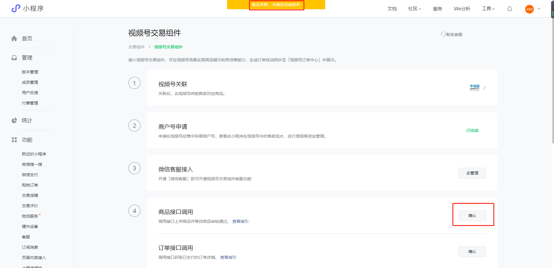 1.商品接口调用--确认,讲“验证失败,未满足完成条件”,怎么回事,解决办法是什么?我的微信客服接入已经完成了。
