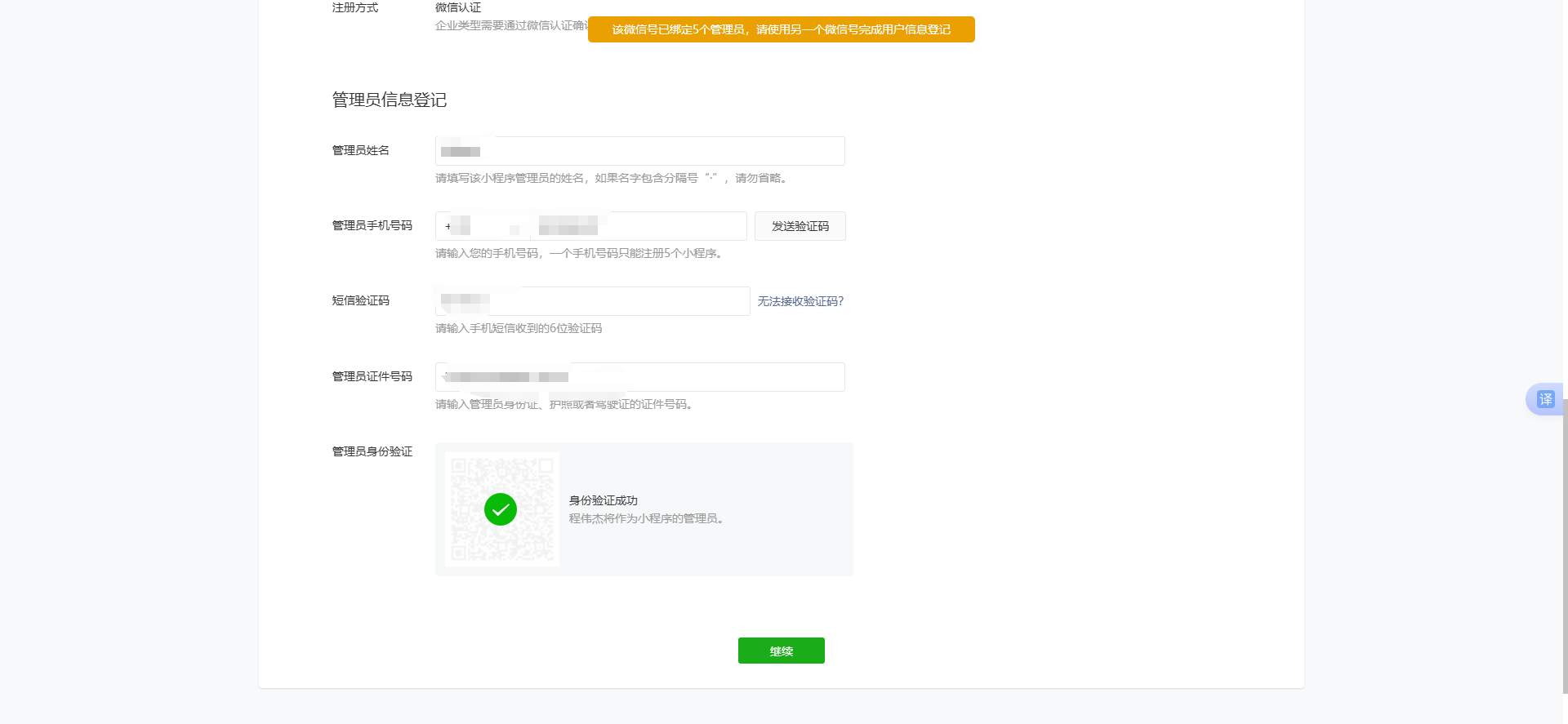 微信号只绑定了一个小程序管理员,再注册怎么提示”该微信号已绑定五个管理员“?