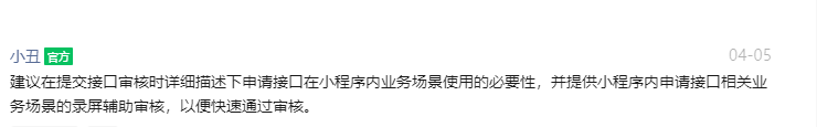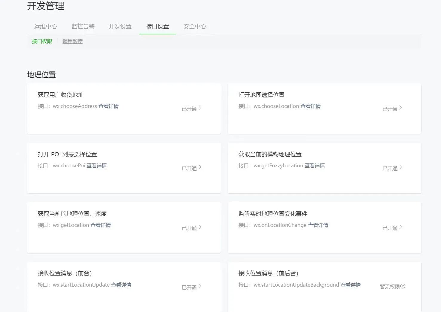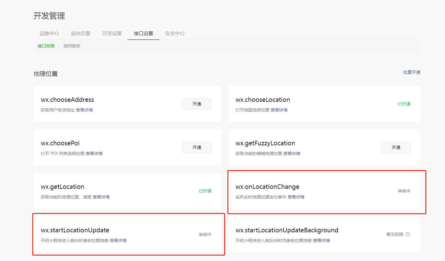 建议在提交接口审核时详细描述下申请接口在小程序内业务场景使用的必要性,并提供小程序内申请接口相关业务场景的录屏辅助审核,以便快速通过审核。关于申请小程序地理位置相关接口的规范可参考:https://developers.weixin.qq.com/community/develop/doc/000646718d40a08a65ed1e2175bc09
