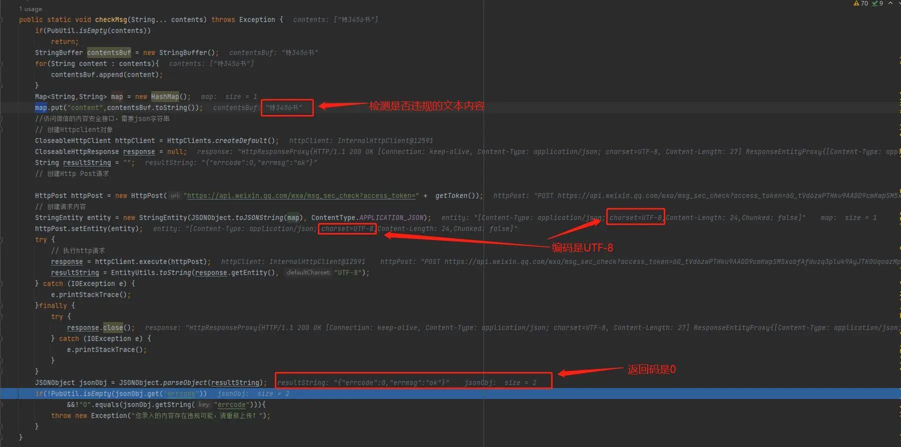我不管录入什么文本,这个接口校验都是通过的,返回码errcode都是0,代码如下,APPID是:wxe7088ddf853ba52d.