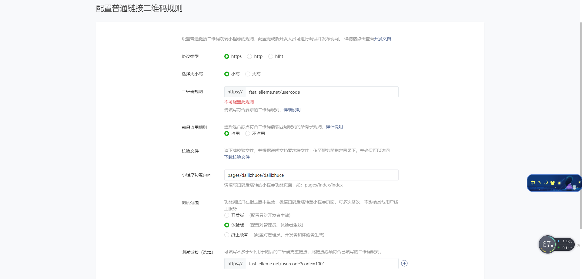您好:我们公司使用”https://fast.leileme.net/usercode“配置“累了么服务”小程序普通链接二维码规则报错,搞了半天才发现有这情况,该域名是刚买不久的,现在需要使用,望尽快处理,谢谢 :)