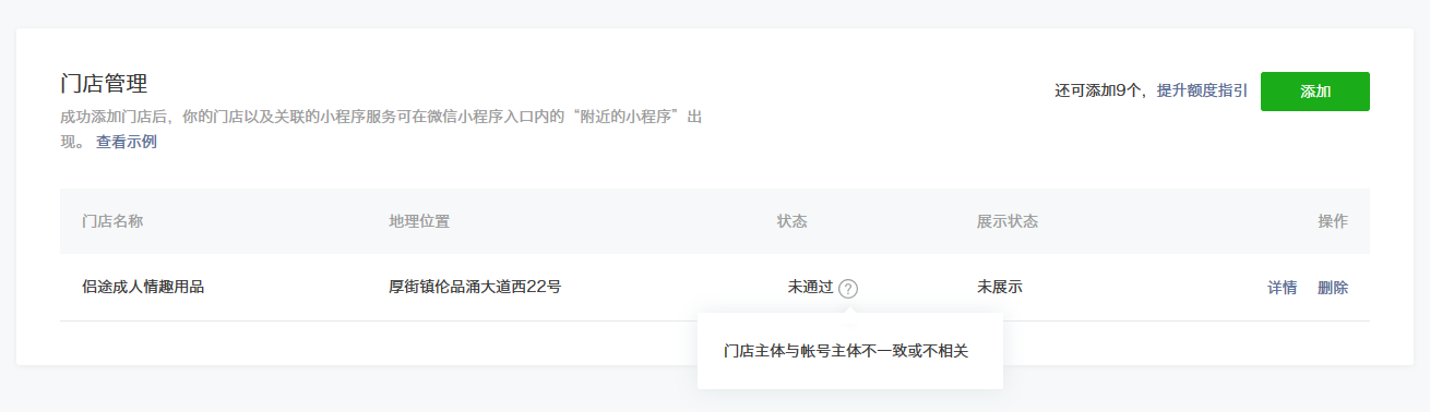 你好,我们的小程序在去年11月申请开通了附近的小程序功能,并且提交门店信息审核成功。但近期发现门店信息不见了,同时多出一个与我们没有任何关系的成人用品店的门店信息。