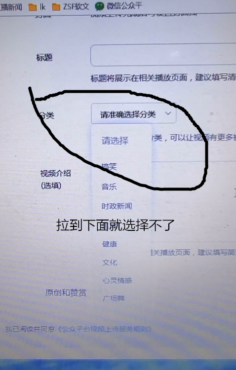 微信订阅号发布视频分类有问题,除去开头的几个大分类可以选择外,到啦下面后就选择不了,试过多次,每次度不行,麻烦腾讯公众号开发团队处理一下