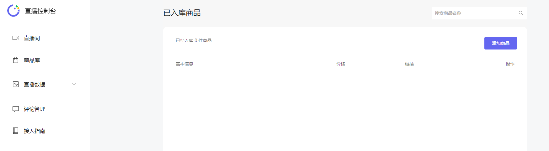 如图,商品库下面没有添加入库以及已入库商品,点击添加商品后显示的是小商店后台商品添加界面。(6月份曾经直播过,当时所有功能正常)