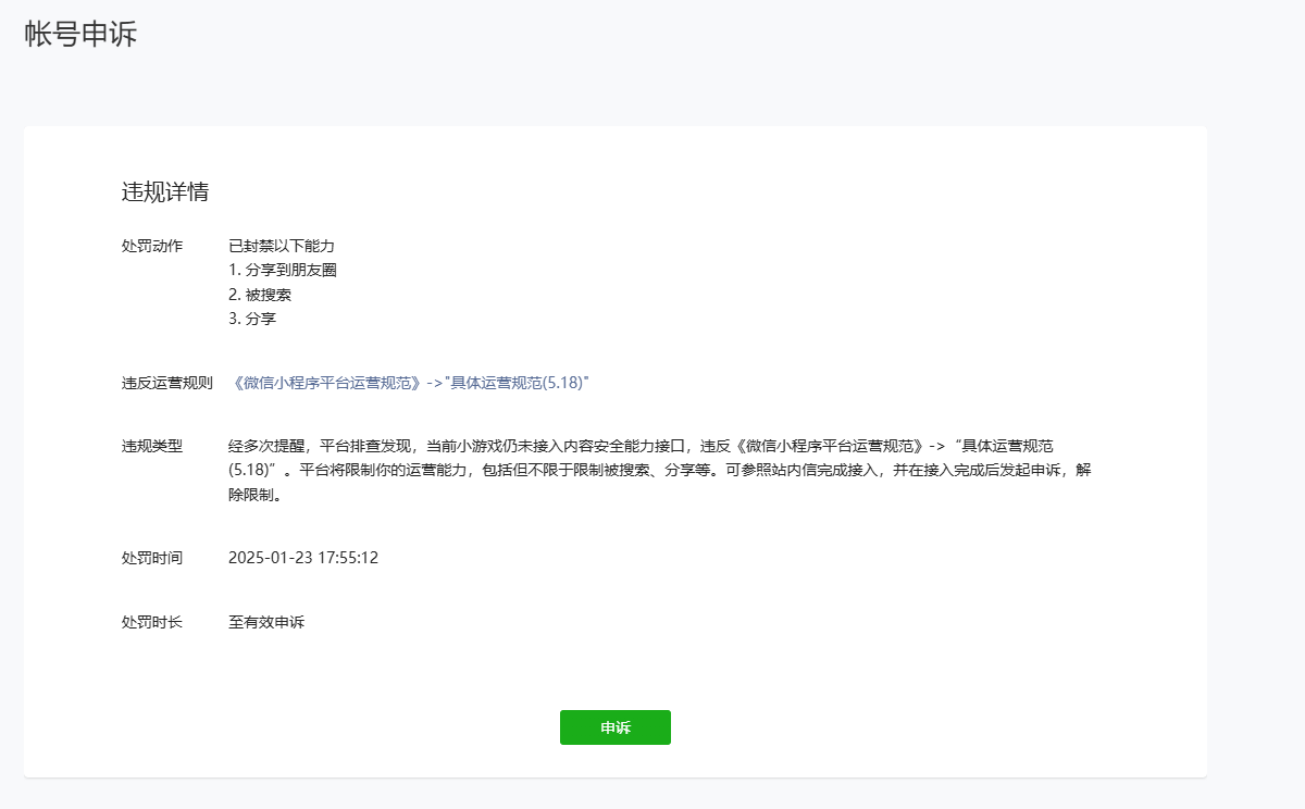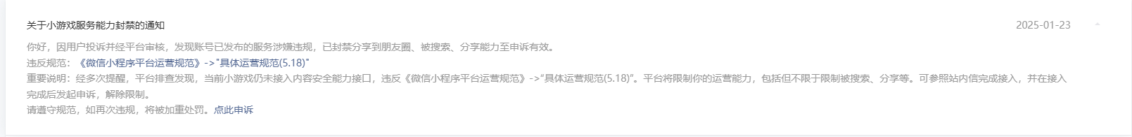 您好,游戏目前是纯单机游戏,没有后端无法接入这个接口,自查游戏中也没有玩家昵称的输入交互,收到了这个警告且封禁了分享,要如何处理?万分感谢。