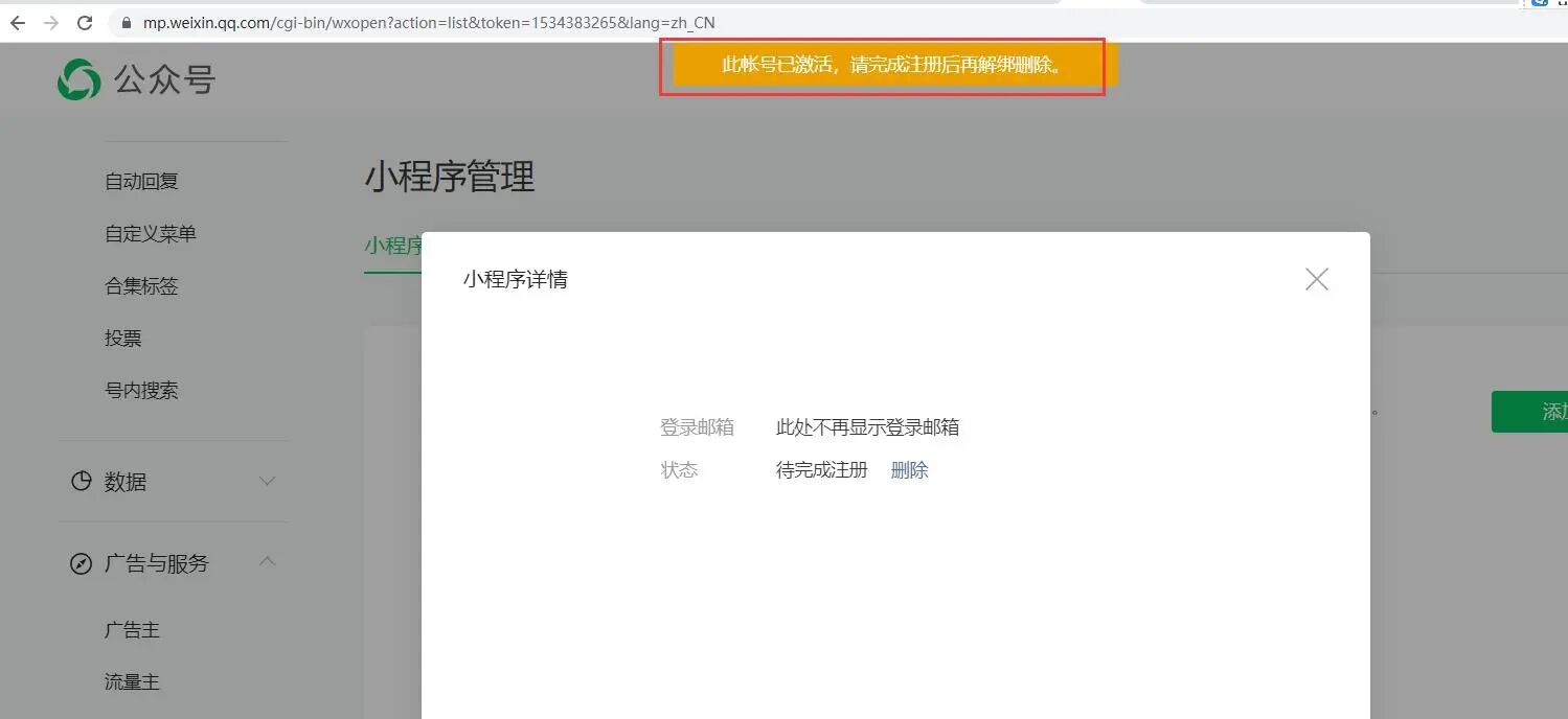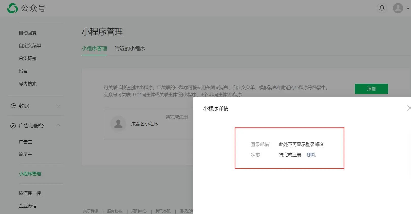 2、待完成注册:右上角头像处退出当前帐号,使用你当时注册小程序时填写的邮箱和密码登录公众平台,继续完成注册即可。