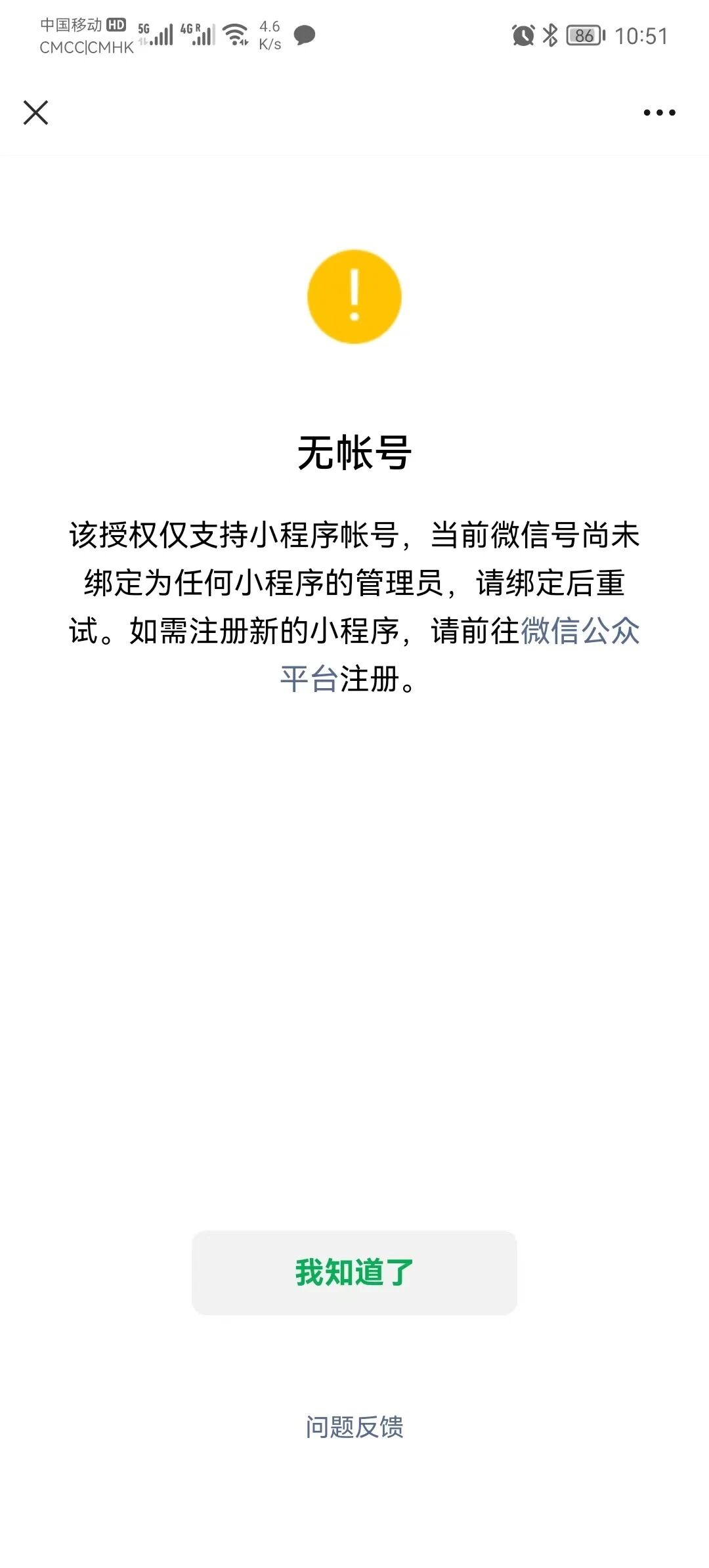 1、授权的问题:使用扫码的微信前往公众号「公众平台安全助手」->绑定查询->微信号绑定帐号,查看是否有绑定作为管理员角色的小程序帐号,页面上有显示。