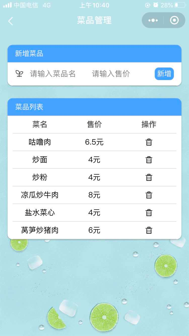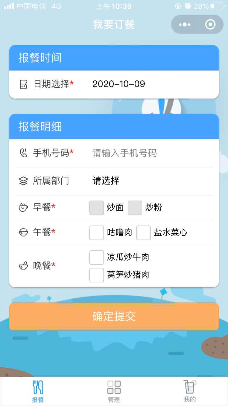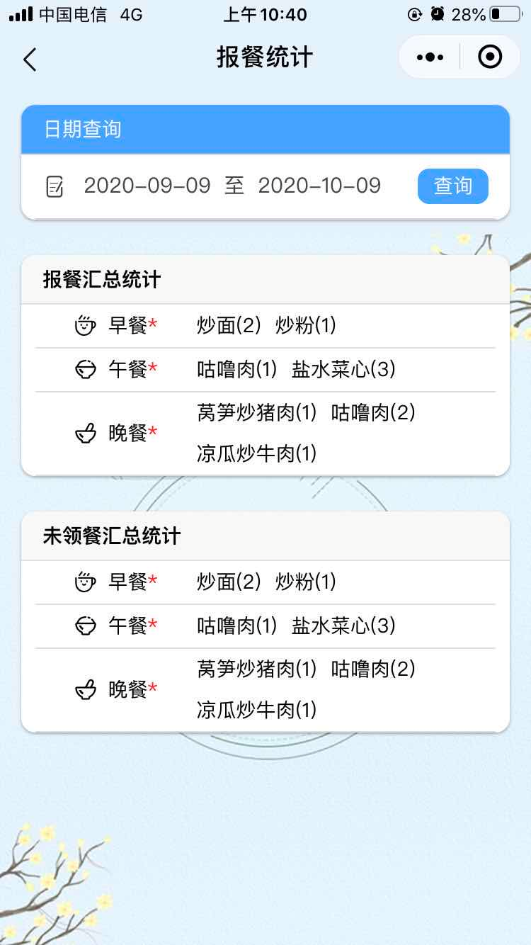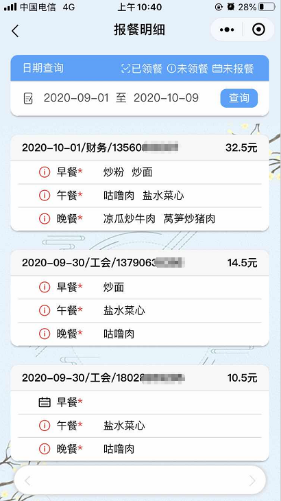 - 普通用户可以根据既定的菜品安排,提早报餐,报餐成功后有历史记录查询。